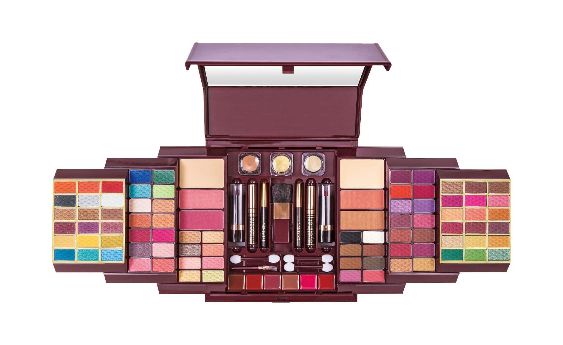 64 Eyeshadows | 7 Matte Eyeshadows | 6 Eyebrow Cakes | 2 Powder Cakes | 6 Lip Colors | 2 Lipsticks | 2 Brushes | 4 Blushers | 2 Concealers | 2 Pencils | 1 Mascara | 1 Eyeliner | 1 Loose Glitter | 3 Applicators